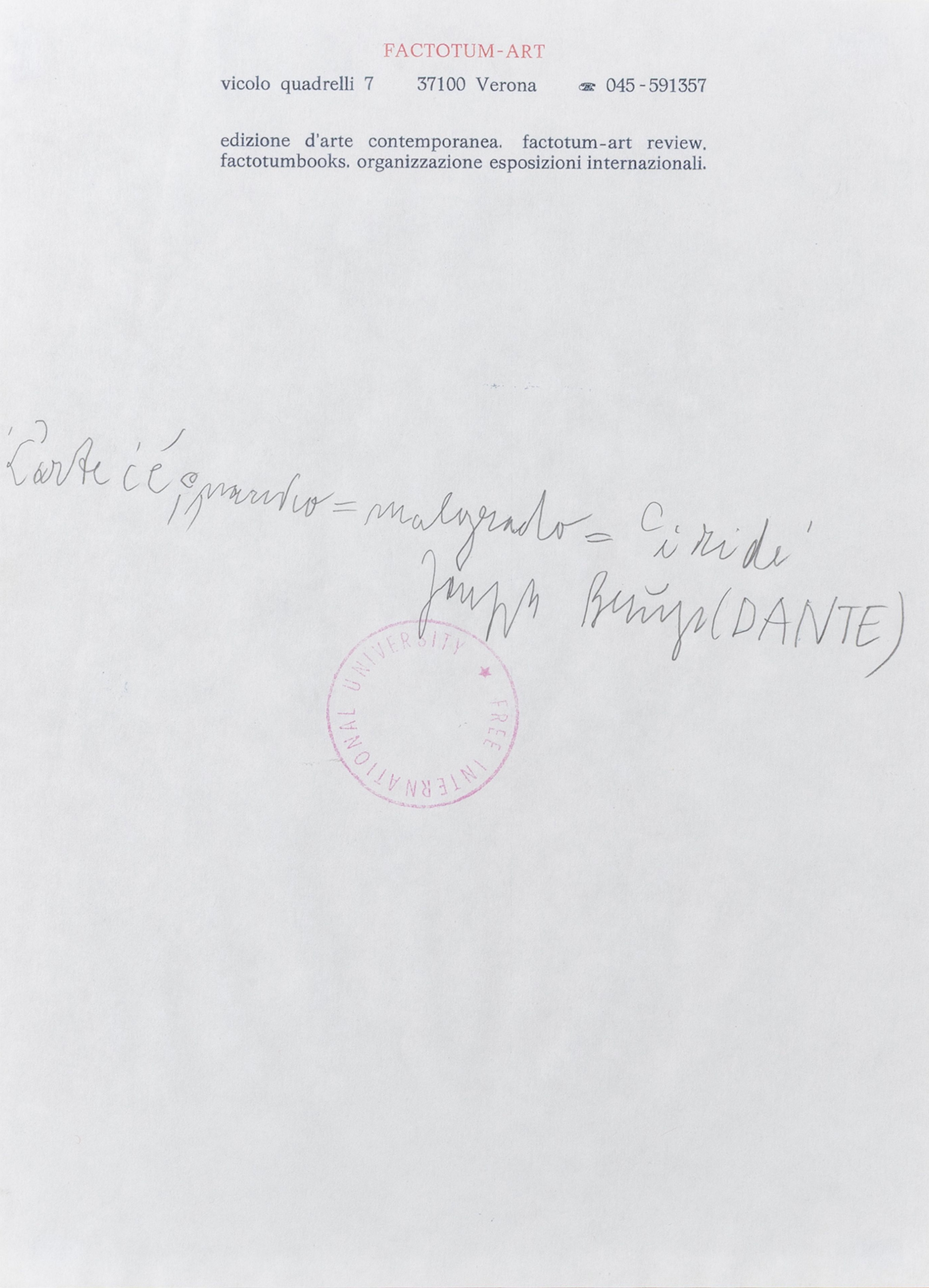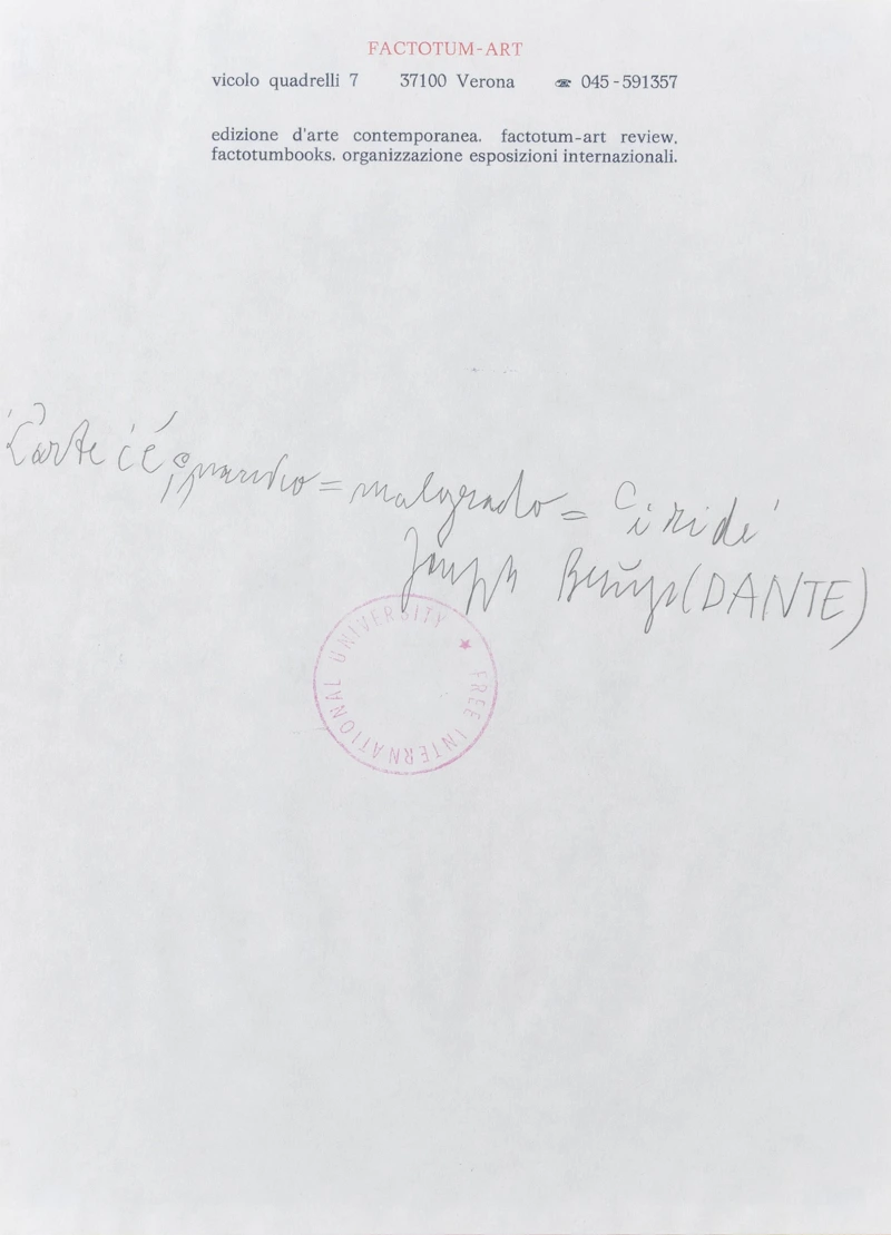 Joseph Beuys nasce nel 1923 a Krefeld, una piccola cittadina al confine olandese della Germania, luogo in cui cresce nel clima oppressivo del periodo Nazista. Da bambino mostra un'interesse e una vocazione per le scienze naturali, ma crescendo prova una forte fascinazione per le arti, e specialmente per la scultura. Tuttavia, allo scoppiare della guerra, decide di iscriversi alla facoltà di Medicina, abbandonando le proprie inclinazioni. Nel 1941 si arruola nella Luftwaffe e viene addestrato come operatore radio in volo. Nel '43 avviene l'evento che maggiormente segna la sua vicenda personale: durante una missione militare in volo sopra la Crimea, l'aereo su cui si trova precipita. Lo schianto provoca la morte del pilota e lascia Beuys gravemente ferito alla testa. Per dodici giorni Beuys rimane in uno stato di semi-incoscienza, fino a risvegliarsi in un ospedale militare tedesco. Negli anni racconterà di essere stato soccorso, dopo lo schianto, da alcuni nomadi tartari, di essere stato accolto in una delle loro tende e curato per otto giorni con impacchi di grasso animale e feltro, materiali poveri ma utili a lenire le gravi ferite al capo. L'episodio penetra nel subconscio di Beuys e diviene un'inarrestabile forza generativa che si declinerà in tutta la sua successiva produzione. Oggi molti mettono in discussione la veridicità dell'accaduto, ma il cosiddetto "Mito Tartaro" rimane fondamentale nella narrazione della costruzione della personalità artistica di Beuys. Alla fine della guerra, dopo aver trascorso alcune settimane in un campo di prigionia degli Alleati, Beuys decide di iscriversi all'Accademia di Belle Arti di Dusseldorf e inizia a studiare scultura sotto gli insegnamenti di Ewald Matarè. In questi anni amplia la sua formazione intellettuale, prediligendo la lettura di autori romantici come Schiller e Novalis, ma anche Joyce; viene inoltre profondamente influenzato dalle teorie antroposofiche di Rudolf Steiner. Continua inoltre e coltivare il proprio amore per la Natura assistendo Heinz Sielmann, che era stato suo istruttore nell'esercito, nella realizzazione di documentari naturalistici. Nel 1961 ottiene la cattedra di scultura all'Accademia di Dusseldorf; nell'anno successivo comincia una fruttuosa collaborazione con Fluxus, un gruppo di artisti neo-Dada, provenienti da vari ambiti, che propongono forme d'arte estremamente innovative, focalizzandosi non tanto sull'opera in sé, ma sul processo creativo. A partire da questo importante incontro, Beuys inizierà a cimentarsi nelle sue prime Aktionen, le sue prime performance. Di questi anni la più celebre è sicuramente Come spiegare la pittura a una lepre morta, avvenuta a Dusseldorf nel 1965, emblematica per la sua densità simbolica e la cerimoniale ritualità dei gesti. Dell'anno dopo è Infiltrazione omogenea per pianoforte a coda (ora nella collezione del Centre Pompidou di Parigi); in entrambe le performance Beuys si serve del feltro, che diviene assoluto protagonista in opere come Abito in feltro (1970, nella collezione della Tate di Londra) e La slitta (1969), in cui viene utilizzato anche il grasso, elemento centrale di Sedia con grasso, del 1964. La collaborazione con Fluxus dura pochi anni, ma Beuys non abbandona il medium dell'Aktion, che diviene un strumento di grande efficacia nell'affermazione di istanze politiche e sociali: gran parte della produzione artistica di Beuys, infatti, sarà indistricabilmente legata a una certa militanza politica, che giunge all'apice nel 1980, quando diviene uno dei fondatori del Partito dei Verdi. La tematica dell'ecologia è certamente cruciale per l'artista (esemplare, in questo senso, è l'opera 7000 querce, realizzata a Kassel in occasione di Documenta 7 e terminata dopo la morte di Beuys), ma anche il problema del diritto alla formazione. Nel 1967 fonda il Partito Tedesco degli Studenti, rispondendo alla richiesta di alcuni suoi allievi di essere ascoltati e rappresentati. Nel 1972 si appella direttamente al direttore dell'Accademia di Dusseldorf e riesce a far ammettere agli studi 142 giovani che non avevano superato le selezioni. Nello stesso anno, però, date le sue posizioni radicali, Beuys viene allontanato dal suo posto di insegnante. Fonda allora l'Università Libera Internazionale per la Creatività a la Ricerca interdisciplinare, con sedi di fortuna sparse in tutta Europa. In generale, è fondamentale per Beuys che l'arte sia resa accessibile e possa essere fruita da tutti: "Every human being is an artist" è una delle sue più famose affermazioni. Va intesa come una celebrazione della creatività intrinseca e innata dell'essere umano, in questo senso da intendersi come "artista". Ognuno può rendersi parte di un processo creativo che, secondo Beuys, ha il potere di sovvertire e rivoluzionare l'ordine prestabilito, con tutte le sue limitazioni e mancanze, specialmente evidenti nella Germania del periodo post-bellico, devastata e lacerata. Ciascun individuo ha la possibilità di modificare la struttura delle relazioni interne alla società utilizzando tutti i mezzi creativi ed espressivi che ha a disposizione: in questo senso Beuys parla di Soziale Plastik, "scultura sociale". È quindi molto comprensibile la sua scelta di produrre opere in multipli. Essi fungono da amplificatori per le sue imprese attivistiche, come vettori che facilitino la propagazione di messaggi politici, ma incarnano anche l'ideologia di un'arte "democratica", disponibile e fruibile a quante più persone possibili. L'opera 2 Shafskopfe ("2 teste di pecora") è stata realizzata in 90 esemplari tra il 1961 e il 1975 e uno di questi fa parte della collezione della Galleria d'Arte Maggiore g.a.m. L'olio su carta è forato al centro; in controluce sono visibili due forme i cui contorni suggeriscono le teste di due pecore, delineate sul nero della pittura con del grasso animale. La scelta dell'ovino non è sorprendente, data la consistente quantità di opere di Beuys in cui appaiono animali. A